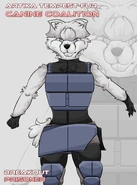 Artika is white-, roughly furred canine, with a left ear clipped at its tip. His eyes are light blue. Attire- wise, he wears a sleeveless, black bodysuit and matching gloves. Over the bodysuit, he has an armoured vest, kneepads and hardened kilt. At his left, he carries a weapon holster for a sidearm.[5]